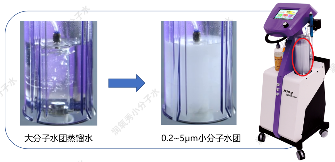 0.2-5μm小分子水团携氧丰富,破裂时氧气进入到水中变成氧气水为皮肤提供氧气,并产生负氧离子,增加头皮供氧量,使细胞内水和细胞外水达到平衡状态,平衡头皮酸碱值,改善干燥、油腻等头皮问题,维持头皮油脂平衡。