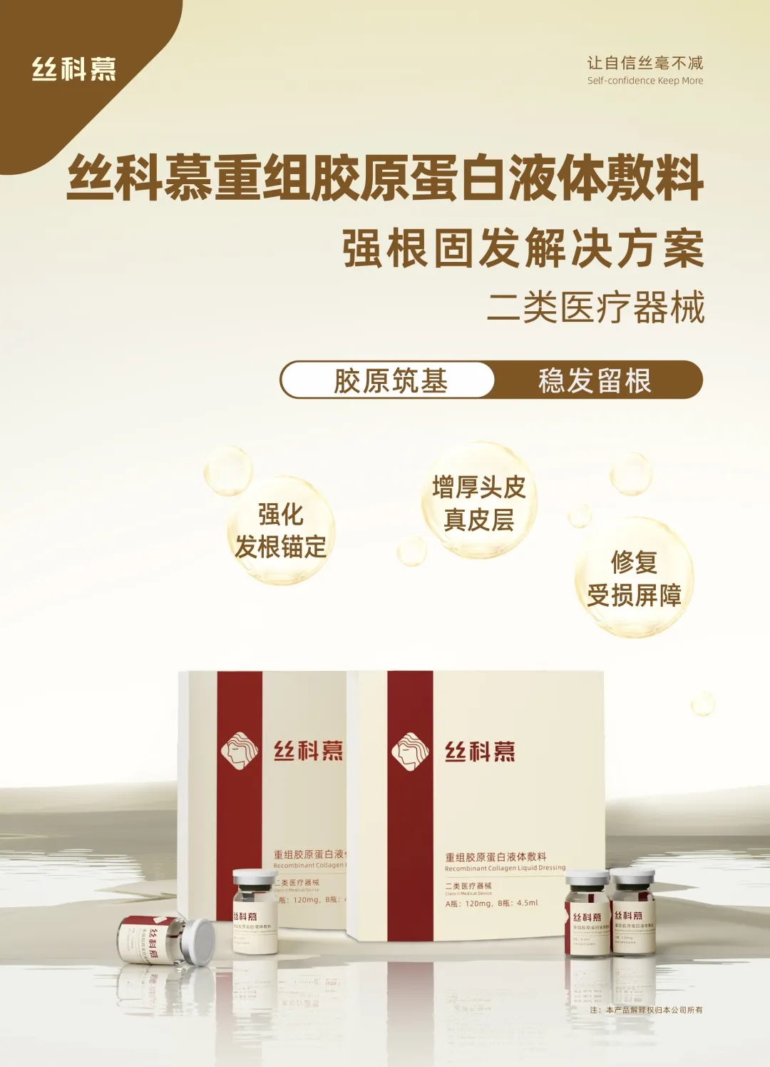 作为二类医疗器械,丝科慕重组胶原蛋白液体敷料采用更安全、更精准的重组Ⅲ型人源化胶原蛋白,从根本上规避了免疫排斥、病毒污染及批次差异等风险;湿热灭菌、无菌提供、不含防腐剂,确保临床使用安全;温和高效的特性,让头皮修复与长期养护更有保障。这一专业品质,与米兰柏羽“品质医美”的定位高度契合。