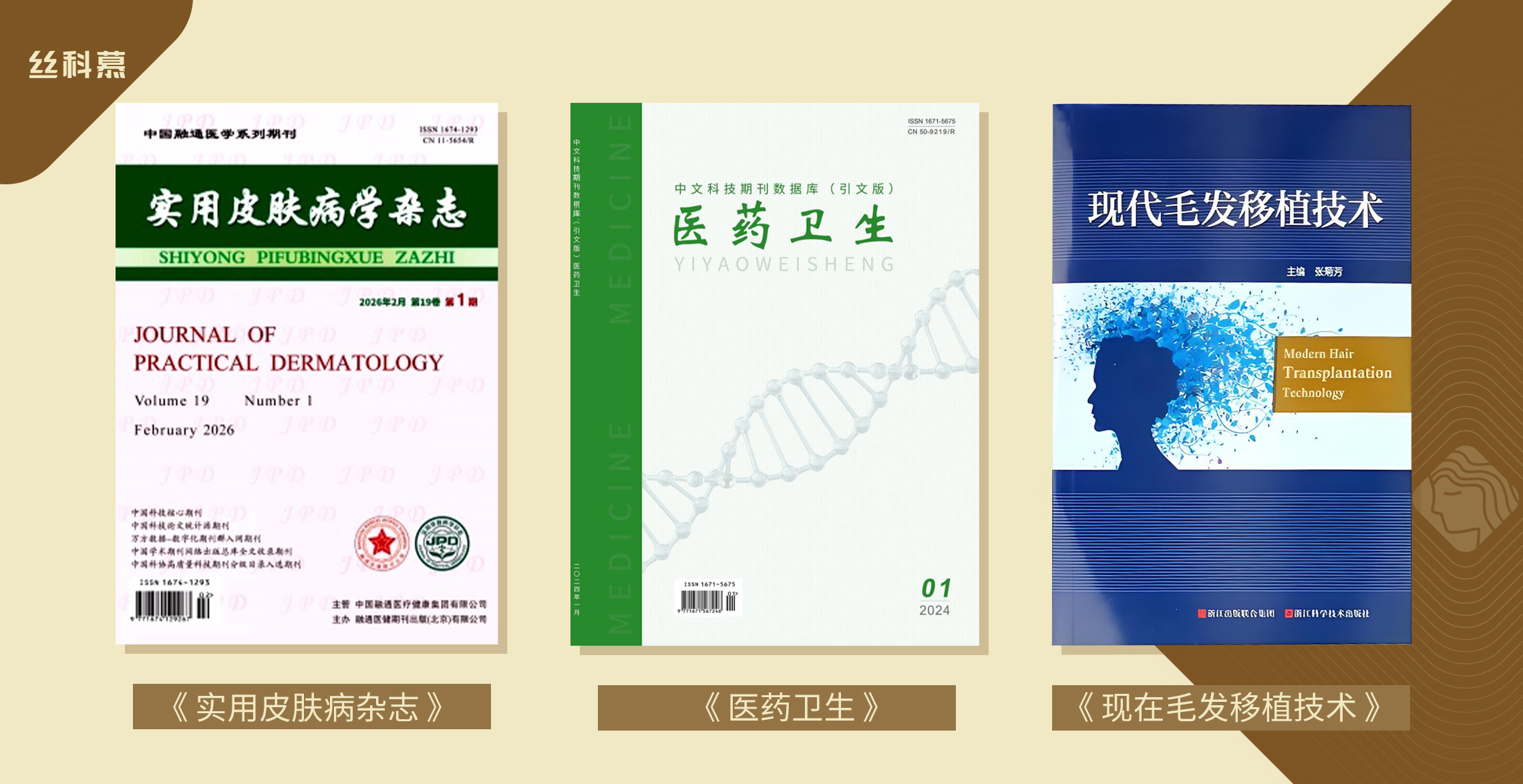 在国内权威期刊【实用皮肤病杂志】、【医药卫生】均有学术文献的发表,且《现在毛发移植技术》有推荐过丝科慕产品。