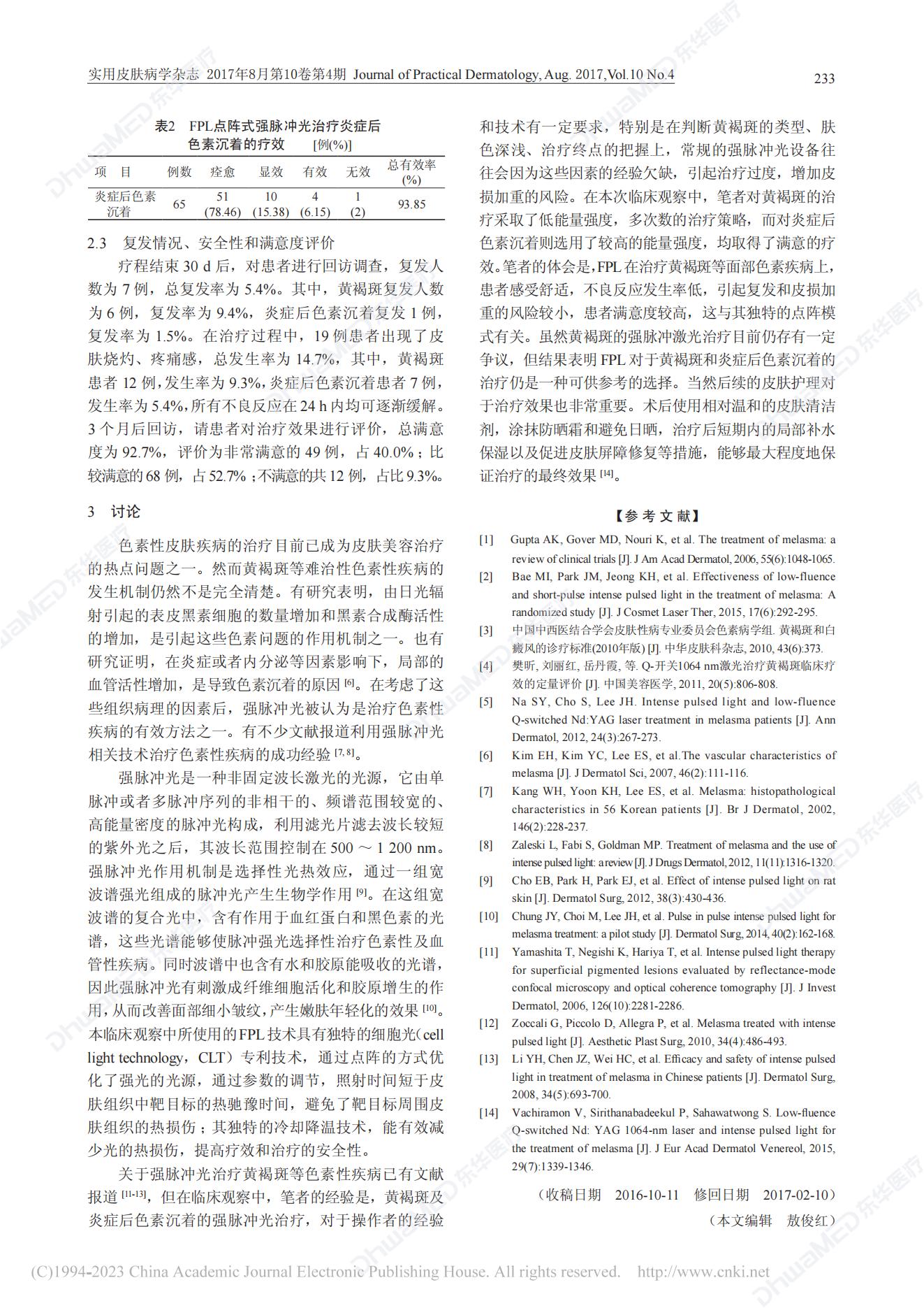 结论 点阵式强脉冲光可用于治疗黄褐斑及炎症后色素沉着,改善皮肤外观。